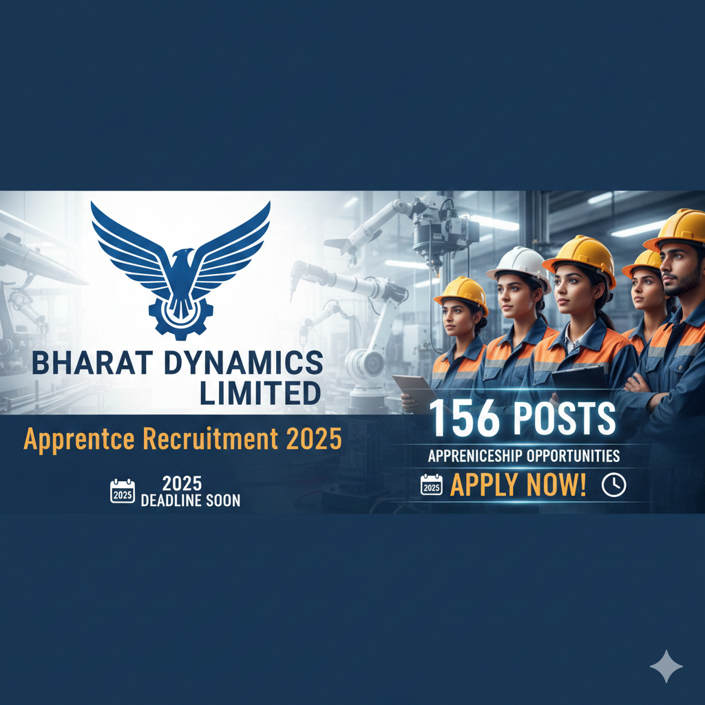 Bharat Dynamics Limited has released a notification on official website for the recruitment of Apprentice. The total vacancy for all the Apprentice posts is 156 posts in different categories. The Application Form Will be started from 24 November 2025, and the candidates can apply till the 08 December 2025. Candidates must have to check the necessary details of age, qualification and pay scale details which are given below. Link for notification pdf and apply are given below.